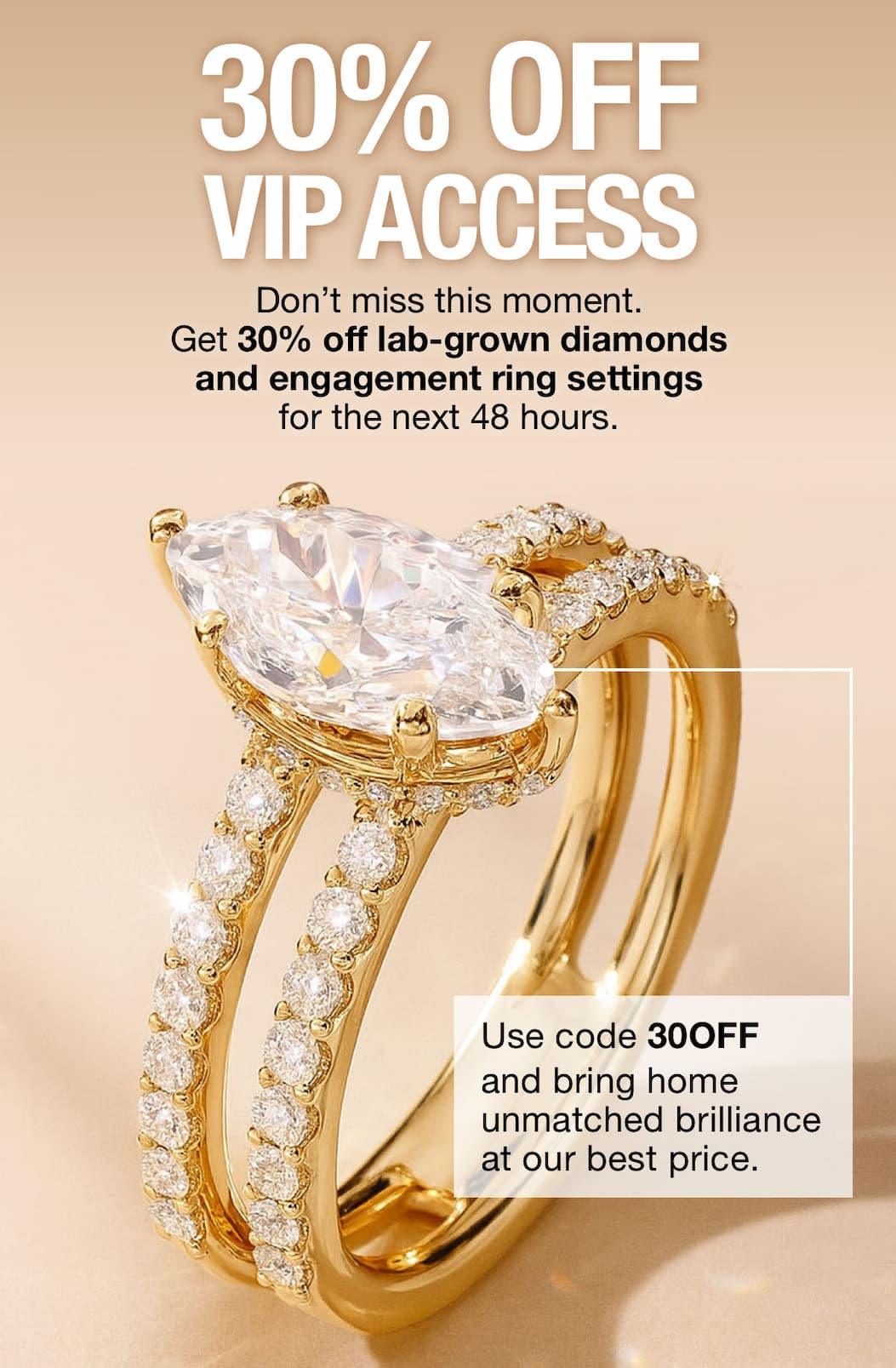 Terms & Conditions: Save 30% on your Engagement Ring Setting and Lab-Grown Diamond purchase with code 30OFF. No minimum purchase required. Excludes Jewelry, Design Your Own Engagement Ring Settings, Natural Diamonds, Wedding Rings and Design Your Own Jewelry Baskets. The promotion is applicable only to eligible items and cannot be applied to taxes, shipping or any additional charges that may apply. Promotion is valid through Friday, September 19, 2025 at 11:59 PM EST.
