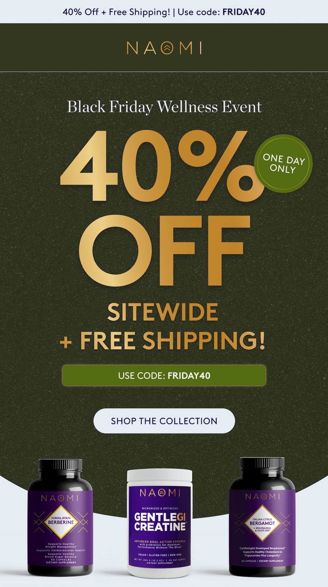 One Day Only Our BIGGEST Sale of the Year! Use code FRIDAY40 to save 40% off sitewide + FREE shipping. | | Code FRIDAY40 applies to one-time purchases only; does not apply to Subscribe & Save. Use code HOLIDAY10 to save an extra 10% on your first shipment of any new subscription. | | Need help? Call 1-877-244-0189 *Valid only on naomiw.com. Cannot be combined with other coupon codes, offers or discounts, and not valid on previous purchases. eGift Cards and Subscribe & Save are not eligible for additional discounts. Purchases are for personal, non-commercial use only. Reselling is not allowed without expressed written consent from Naomi Whittel Brands. We reserve the right to cancel any order due to unauthorized, altered or ineligible use, and to modify or cancel any offer due to system error or unforeseen problem. Other restrictions may apply. Free Shipping is valid for standard shipping on U.S. orders only. Note: While our products are gluten-free, they are manufactured in a facility that is not gluten-free. This is important information for those with celiac disease - not for the general population looking to cut out gluten for general wellness and weight management purposes †These statements have not been evaluated by the Food and Drug Administration. This product is not intended to diagnose, treat, cure or prevent any disease. If you are pregnant, nursing, taking medication, or have a medical condition, consult your physician before using this product. Naomi Whittel Brands 747 SW 2nd Ave, Imb #3, #301 Gainesville, FL 32601. Read our full disclaimers here. No longer want to receive these emails? Unsubscribe | | | | |