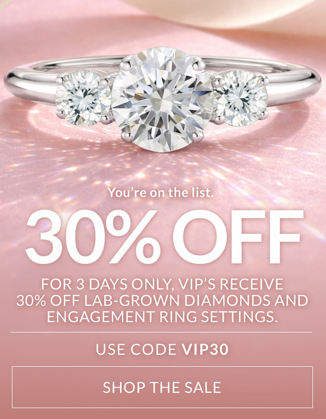 Terms & Conditions: Save 30% on your Lab Grown Diamond or Engagement Ring purchase with code VIP30. No minimum purchase required. Excludes Natural Diamonds, Jewelry, Wedding Rings,Custom Engagement Rings, Custom Wedding & Eternity Rings, Custom Jewelry, Design Your Own Pendant & Earring Baskets. Offer cannot be combined with other promotions, discounts, or offers. The promotion is applicable only to eligible items and cannot be applied to taxes, shipping, or any other additional charges that may apply. Promotion is valid through Wednesday, January 14, 2025 at 11:59 PM EST.